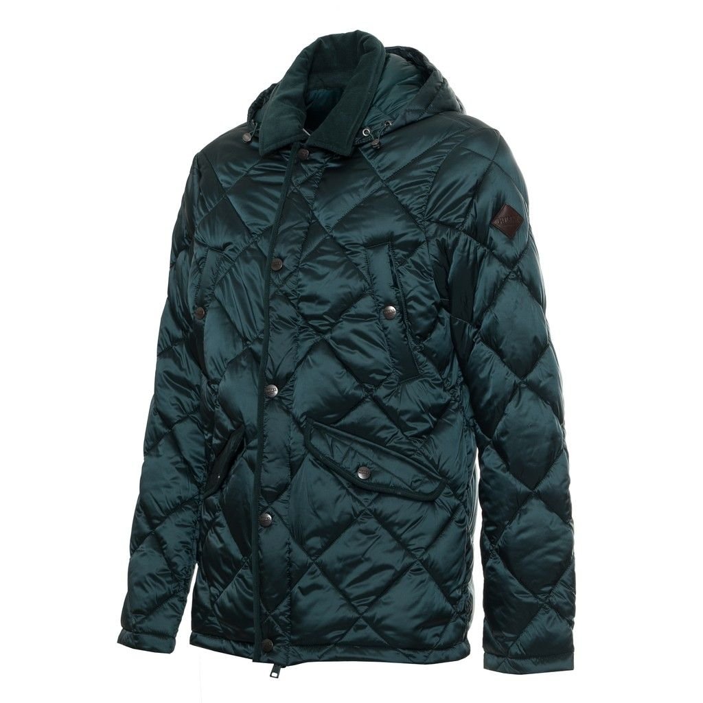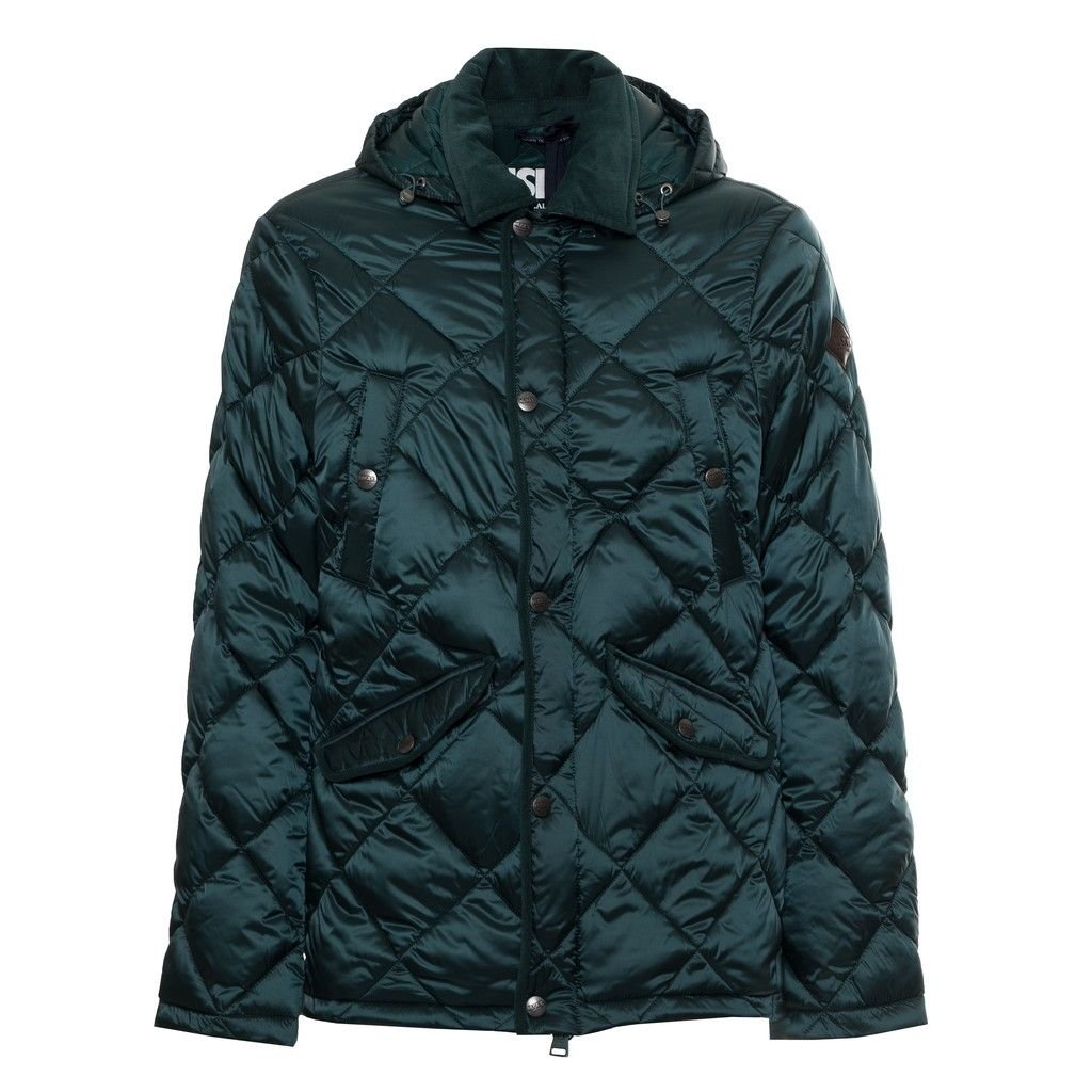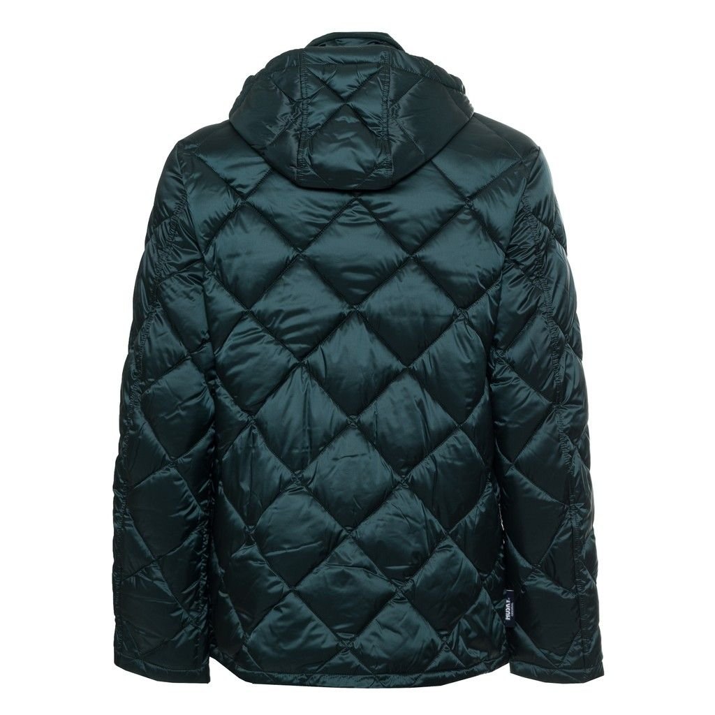 DOWN JACKET, FOR MEN, POCKETS, WITH HOOD, QUILTED, SOLID COLOUR, PRESS STUDS CLOSURE, WITH LOGO