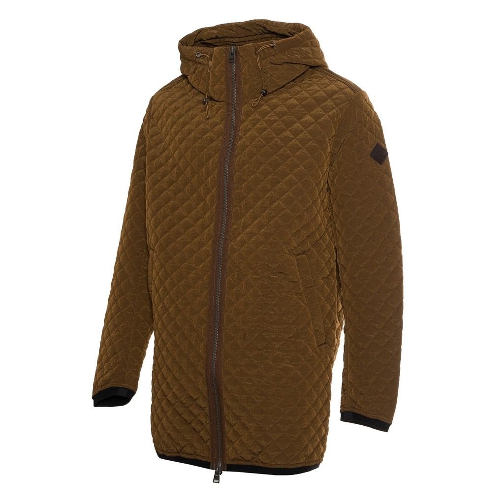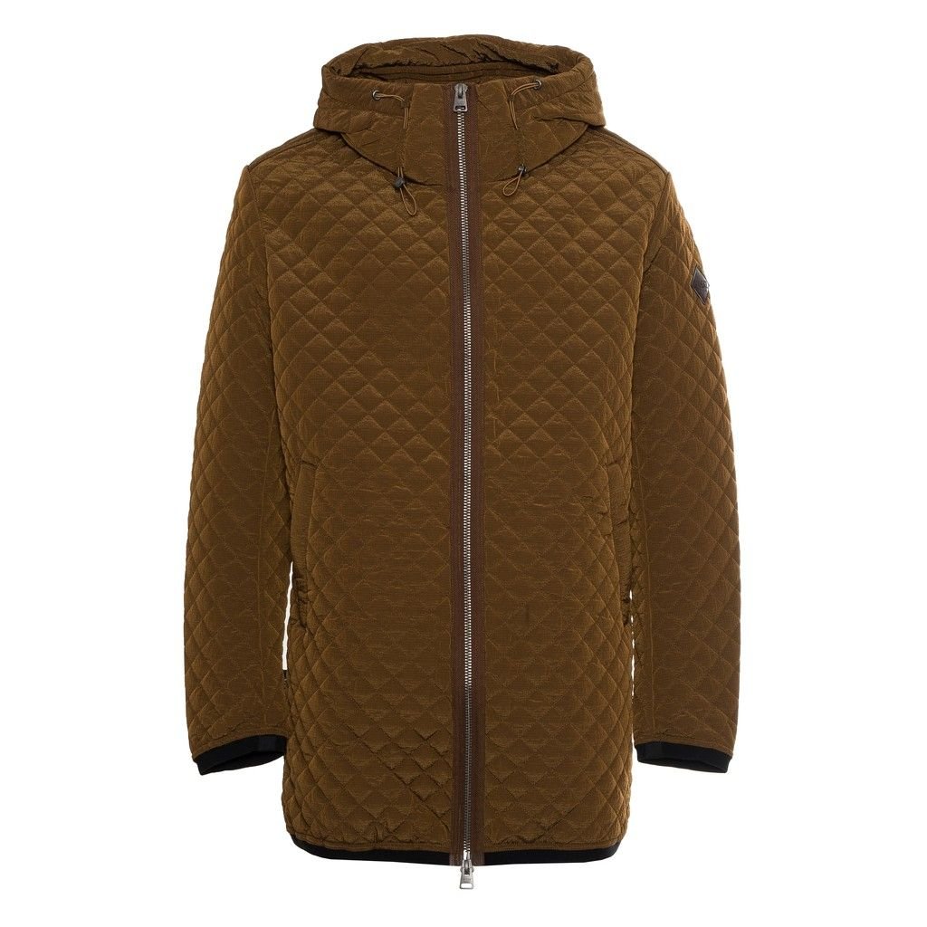 DOWN JACKET, FOR MEN, WITH HOOD, QUILTED, SOLID COLOUR, WITH LOGO, ZIP CLOSURE